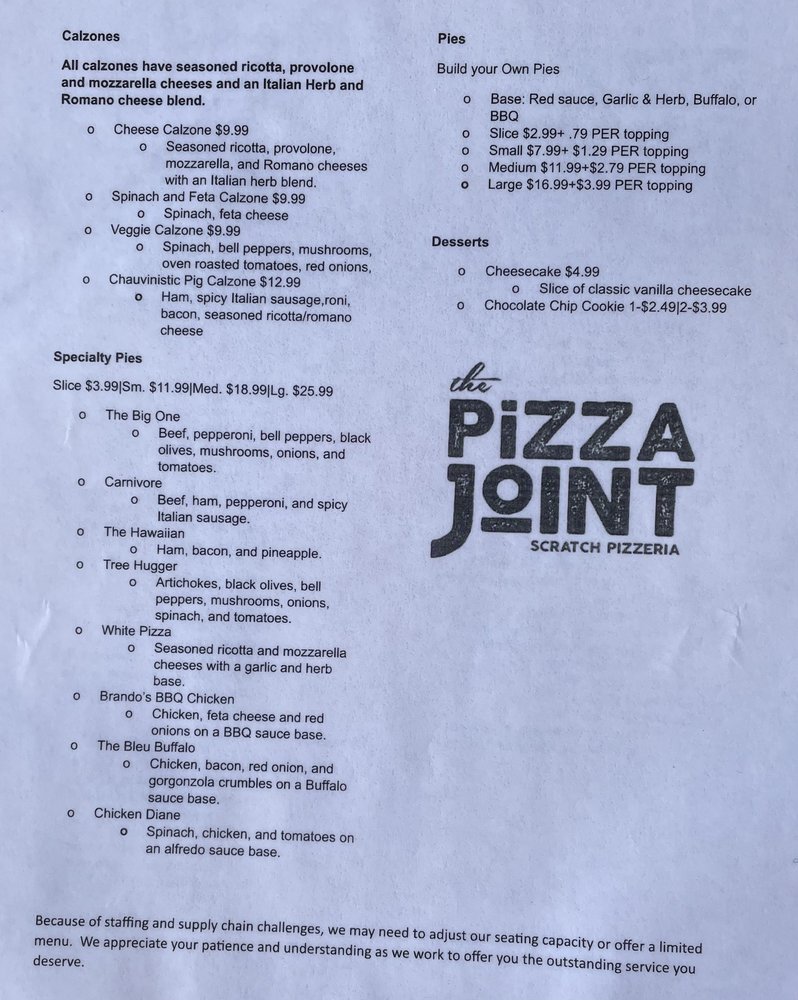 “ The Pizza Joint helped us with a large order for a work lunch. The food was delicious (including the gluten free pizza). The staff were so helpful in making the day smooth with the large order. We're very grateful and highly recommend the restaurant! ”